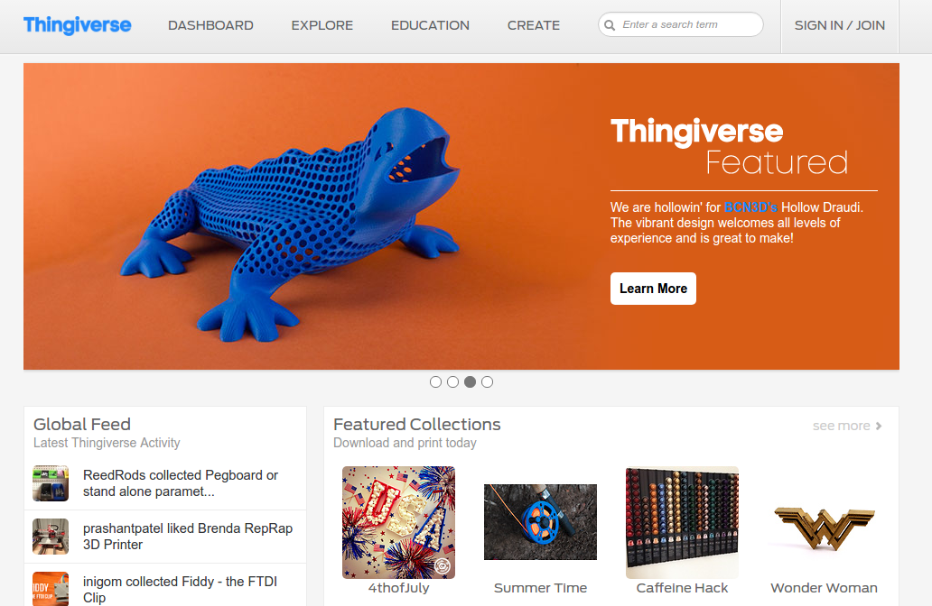1.- Thingiverse: Es una comunidad de diseños de objetos imprimibles, es la más grande comunidad de impresión 3D, todos estos modelos son Creative Commons, esto quiere decir que puedes utilizar los diseños e incluso alterarlos. (https://www.thingiverse.com/)