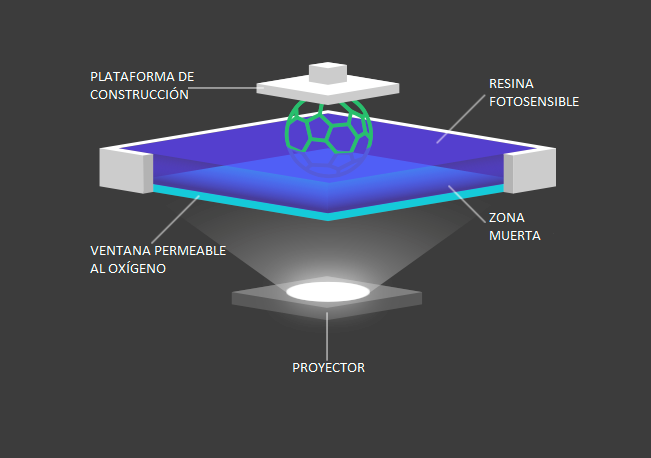 Los objetos tridimensionales son obtenidos mediante la adición de finas capas, impresas una encima de otra. Cada capa es una imagen que el proyector lanza hacia la resina generando así nuestra capa solida, la pieza que se imprime queda adherida a una plataforma la cual sube y baja para ir obteniendo las capas necesarias hasta obtener la pieza terminada.