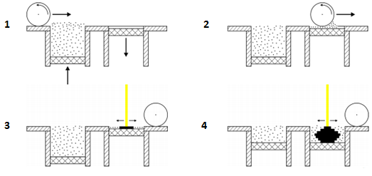 La impresión se realiza capa por capa, a partir de un polímero en polvo unidos, gracias a la temperatura generada por un láser CO2, la impresora consta de dos recipientes donde uno se encentra lleno del polvo y el otro esta vació. El proceso inicia cuando el deposito que contiene el polvo sube y el vació baja, después con un rodillo desplaza el polvo que sobresale llevándolo al recipiente vacío, generando la primer capa en blanco, a continuación el láser traza la figura de la primer capa de nuestra pieza a imprimir, fundiendo el polvo y solidificandolo, de la misma manera se generan las siguientes capas hasta tener la pieza 3D terminada