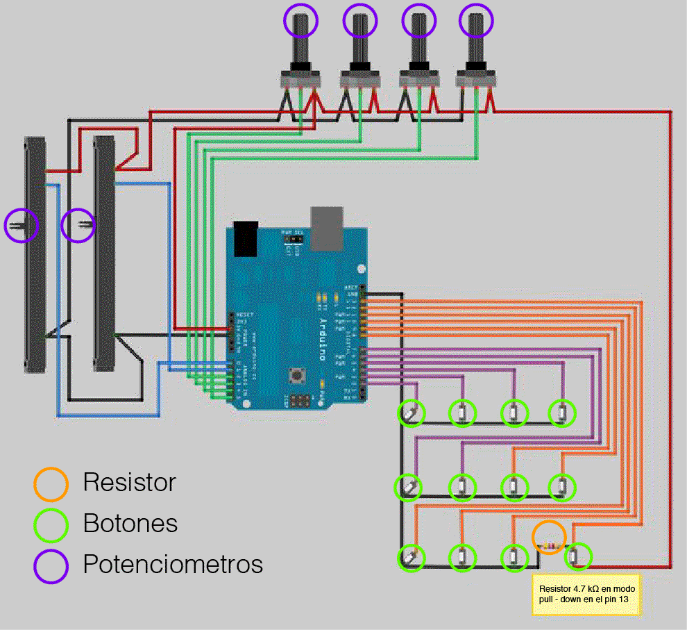 Vista general de cableado en los botones y potenciometros. Cada cable se cortó a una longitud de 25 cm para que pudiéramos conectar nuestro controlador de manera sencilla.